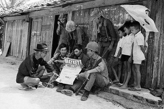 Người lính VNCH đang đi hành quân song vẫn bỏ tiền túi dừng lại mua báo cùng đọc tin tức và nghị luận. H́nh trên cho thấy họ đang chăm chú đọc trang đầu quan trọng nhất của các tờ nhật báo “Độc Lập” và “Trắng Đen” là trong số những tờ báo được nhiều người mua đọc.