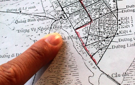 (Ngã tư nơi có 3 ngôi chùa ở góc đầu đường là nơi có đánh dấu X trên chóp bản đồ, cách cửa nam của thành cổ khoảng trên 200m theo đường thẳng, thuộc phường Đồng Đình)