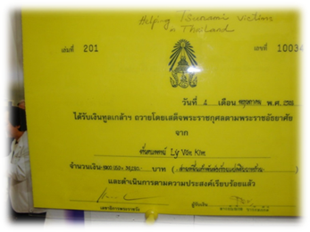 Sau đó khoảng vài tuần ông Chittrapat có gởi cho tôi giấy báo nhận được số tiền cứu trợ kèm theo lời cảm ơn của Quốc Vương Buhmidol Thái Lan (Office's letter Ref. No 0002.4/6026 dated 2005 conveying His Majesty the King's thanks for helping Tsunami).