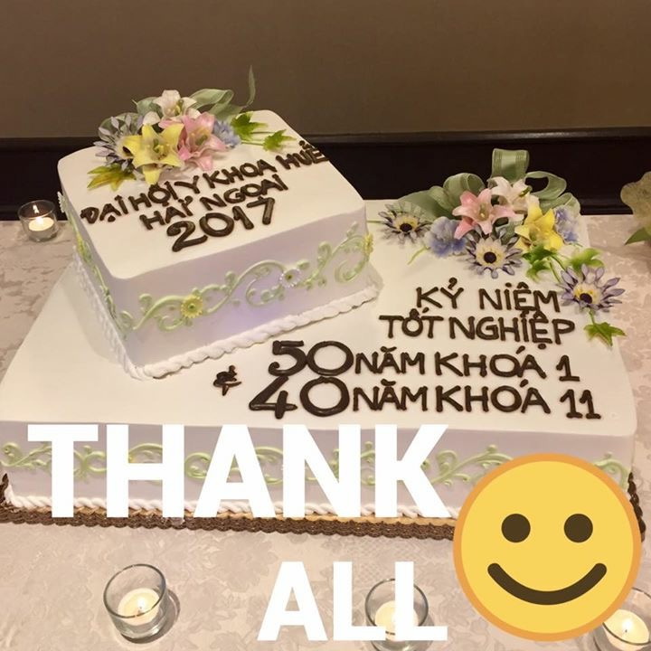 Sau diễn văn nhậm chức của tân Chủ Tịch Lê Đình Thương, một cỗ bánh rất lớn với hàng chữ Đại Hội Y Khoa Huế Hải Ngoại 2017 ở một góc cao và hàng chữ Kỷ Niệm Tốt Nghiệp 50 Năm Khóa 1 & 40 Năm Khóa 11, ở mặt bằng còn lại, được đẩy ra trưng bày trước toàn hội trường và được chính cựu và tân Chủ Tịch Châu Lam Sơn và Lê Đình Thương cùng đại diện khóa 1 là BS. Đoàn Yến và đại diện khóa 11 là BS. Tôn Nữ Hải Lan, cắt tượng trưng sau khi BS. Võ Đình Hữu, chủ tịch Cộng Đồng Người Việt, lên tiếng khen ngợi tập thể các BS xuất thân từ ĐH YK Huế và Hội Y Khoa Huế Hải Ngoại.