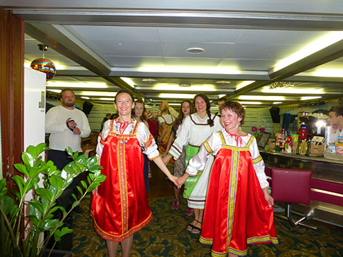 Buổi chiều trước khi tàu đến St. Petersburg, trên tàu có màn trình diện của thủy thủ đoàn. Thường thường những buổi sau bữa ăn, có trình diễn nhạc/hát, hóa trang ‘’cướp biển‘’ v.v… Đặc biệt, một buổi tối, người ta tổ chức ‘’trình diễn văn nghệ bỏ túi‘’ cho 3 nhóm du khách. Chúng tôi tham gia cùng nhóm Vikings trình diễn hài kịch nhỏ. Nhóm Ý trình diễn màn kịch ngắn hóa trang, nói tiếng Ý. Chúng tôi chẳng hiểu gì. Riêng nhóm Việt Nam, chỉ bà cỡ 50 tuổi hát 2 bài liên tiếp. Bài hát Quan Họ, nghe ra tốt. Tiếp đến là bài ‘’Em ở Nghệ An, em nhớ Mạc Tư Khoa có bác‘’. Bài đồng ca ‘’Như có bác Hồ trong ngày vui đại thắng‘’. Nghe mà đau cái đầu hết biết. Người bạn Nauy hỏi chúng tôi nội dung vì nghe mấy chữ '' hồ-chí-minh ''.