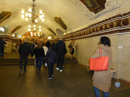 Phải nói rằng Moskva có những trạm ga tàu điện ngầm đẹp đẽ, nghệ thuật và sang trọng nhất thế giới. Hàng ngày có từ 8 đến 10 triệu người Moskva dùng tàu điện ngầm. Hệ thống tàu điện ngầm được hình thành dưới thời cực thịnh của chế độ Sô Viết, được khởi công từ năm 1932. Vào thời kỳ đó, hệ thống nhà thờ bị cộng sản Nga phá hoại, cho nên chế độ mới nghĩ đến việc trang hoàng các trạm ga tàu điện ngầm để thay thế cho giới bình dân chiêm ngưỡng. Các hầm tàu nằm sâu 90 mét so với mặt đất để tránh bom nguyên tử khi chiến tranh xẩy ra. Các trạm tàu điện ngầm được gọi là Nhà Ga Cách Mạng. Ngày 15.05.1935, trạm đầu tiên được khánh thành. Hiện nay Moskva có 200 trạm với 330 km đường sắt. Chúng tôi xuýt xoa trước vẻ đẹp kiêu sa khác nhau của các ga tàu điện ngầm với tranh vẽ, tượng chạm trổ cùng với những chùm đèn sang trọng như trong cung điện vua chúa.