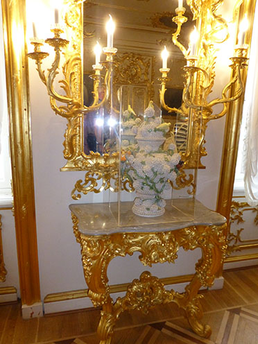 Đây là Cung điện Mùa Hè của Sa Hoàng, nằm 25 km đông nam St. Petersburg, được xây năm 1717, từng bị tàn phá bởi bom của Đức Quốc Xã trong Đệ Nhị Thế Chiến, và được trùng tu sau khi Liên Sô sụp đổ, để phục vụ du lịch. Tòa lâu đài bên ngoài sơn màu trắng và xanh dương. Các phòng đều có sơn son thếp vàng, mang tính chất sang trọng cao sang của các hoàng cung. Ở các điểm du lịch, du khách có dịp đi dạo qua các chòi làm gian hàng bán đồ kỷ niệm đặc trưng Nga. Không có cảnh níu kéo hoặc trả giá náo nhiệt như ở Bắc Kinh.