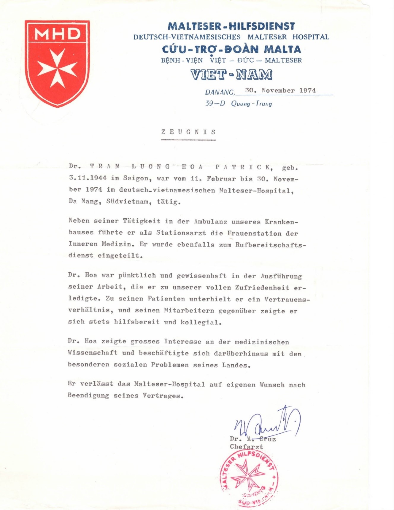 Để chuẩn bị cho sự thành lập một BV nằm trên đất liền, hội đoàn thiện nguyện Malteser của Tây Đức đã có những toán y tế nằm rải rác tại Đà Nẵng, Quảng Nam, Hội An, An Hòa. Chính tại bệnh viện Quân Dân Y phối hợp tại Hội An là nơi tôi tình nguyện xin vào thực tập trong 2 mùa hè 1970 và 1971, tôi gặp và kết thân với toán y tế và kỹ thuật của Malteser nằm trong BV, và qua đó, tôi có thử vài món ăn của Đức như Bratwurst (hot dog), bánh mì đen và bia Đức. Ngoài ra, Hội Malteser còn thành lập một trung tâm nuôi và săn sóc trẻ mồ côi, một trung tâm săn sóc người bệnh tâm thần, trường học, và cung cấp một xe cấp cứu cho thị xã Đà Nẵng.