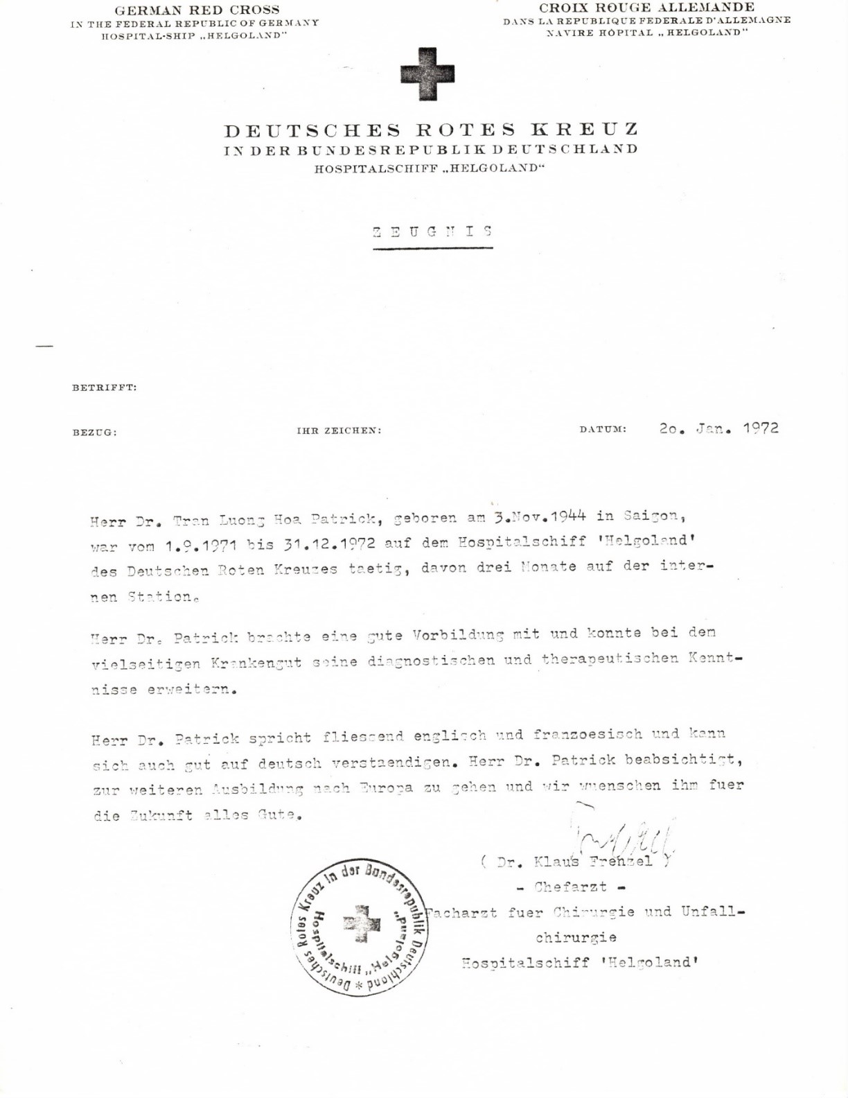Qua liên hệ từ trước, trường Đại Học YKH gởi các bác sĩ ưu tú đã tốt nghiệp của mình vào làm việc tại BV Việt Đức từ năm 1973, với cam kết bán chính thức là về sau các BS này sẽ nhận được học bổng tu nghiệp tại Tây Đức. Đó là quý đàn anh BS. Nguyễn Văn Chữ, về Giải Phẫu (BS. Chữ: RIP, tai nạn phi cơ bị không tặc nổ trên bầu trời Phan Rang tháng 9, 1974), Nguyễn Thị Bảy, Giải Phẫu; Ngô Văn Tường, Trần Lương Hoa, Nội Thương. Kèm theo bên dưới là tài liệu chứng nhận BS. Trần Lương Hoa làm việc tại tàu BV Helgoland và tại BV Malteser Việt Đức. Ngoài công việc trong bệnh viện, vào các cuối tuần các BS Việt Nam và Đức còn đến chữa trị và theo dõi các bệnh nhân cùi tại trại Cùi Hòa Vân, nằm riêng biệt dưới chân núi Hải Vân. Họ cũng đưa nhiều bệnh nhân có âm tính với cùi sau 1 thời gian chữa trị về BV Việt Đức để giúp ghép lông mày.