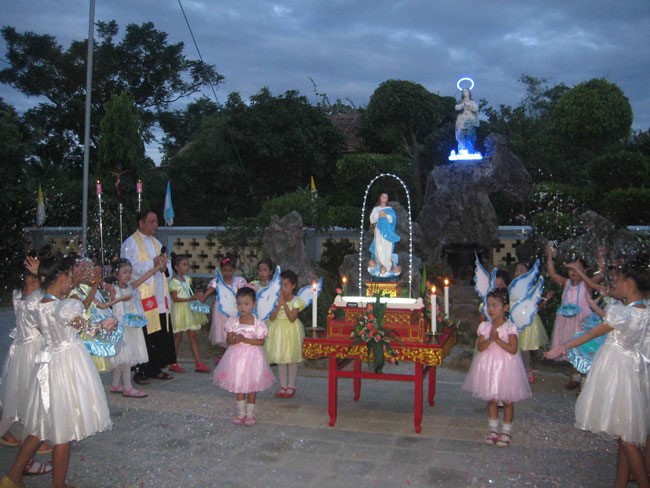 Toán thiên thần luôn được sự chú ý và hoan nghênh của mọi người. Toán gồm 6 người con gái nhỏ tuổi, mũm mĩm dễ thương được các Sơ trang điểm má trắng môi hồng, ăn mặc áo đầm satin trắng bóc, mang đôi cánh trắng trên 2 vai, đi ngay phía sau của bàn kiệu Đức Mẹ, vừa bước vừa rung đôi cánh thiên thần lên xuống rất điệu. Phía trước bàn kiệu Đức Mẹ đang được 6 chị với đồng phục áo dài màu xanh khiêng trên vai, có một toán con gái khác với đồng phục áo dài trắng quần dài trắng, tung những cánh hoa được cắt nhỏ đựng trong giỏ mây có bọc vải trắng lên trên trời. Trong toán thiên thần nữ đó, luôn có một người bà con cùng tuổi với tôi (Thanh Hiền, mà tôi kêu tên ở nhà là Ni, sau này đi học xa ở Couvent des Oiseaux ở Đà Lạt), được chọn làm thiên thần nhiều năm. Tôi nhận thấy đoàn thiên thần không bao giờ có con trai, nên tôi nghĩ thiên thần luôn phải là con gái. Mãi về sau tôi mới biết thiên thần có cả nam lẫn nữ, mà ngay ông Micae là tổng lãnh các thiên thần, cùng với ông Gabrie. Đáng tiếc hồi xưa ấy tôi không được chọn làm thiên thần nam, nên phải chờ đến hơn cả chục năm sau mới được làm thiên thần mũ đỏ.