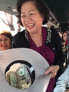 Sau nhiều màn ca hát kể chuyện, chiếc mũ đầy cả giấy xanh, nhưng khi đó túi các bạn đă vơi bạc lẻ, vừa thấy bạc "chẵn" được kéo ra Tinh Châu liền "phán" ngay cho Mỹ Đức là không được thối tiền, cho nên từ đó chiếc mũ tăng giá trị lên gấp bội! Sau một hồi ca hát thỏa thích, chúng ta đóng góp được hơn $355, ư kiến tuyệt diệu của các thiên thần là sẽ dùng số tiền đó để biếu thêm bonus cho tiền tip đă quy định cho tài xế và tour guide. Thật là ư kiến quá hay v́ sau mấy ngày du ngoạn với chúng ta, một lũ "nhất quỷ nh́ ma thứ ba YKH" ni phá phách, náo nhiệt như vậy mà anh tài xế và anh tour guide hăy c̣n giữ được "cool" để lái xe như thế là một điều đáng phục.