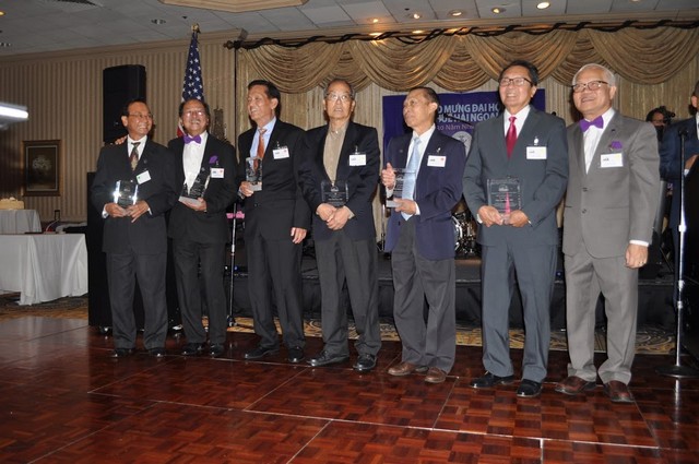 Sau đó, MC Nguyễn Thanh kính mời quư anh chị trong Ban Tổ Chức lên sân khấu để Chủ Tịch có món quà tặng. Chủ tịch Châu Lam Sơn hết lời cảm ơn Ban Tổ Chức đă hết sức nhiệt t́nh lo chu toàn mọi công việc cho Đại Hội được diễn ra một cách tốt đẹp. Quư anh chị Vơ văn Hạnh-Thiên Kim, Nguyễn văn Bách-Mỹ Đức, anh chị Hoàng Anh Tuấn- Elizabeth Huyền, anh chị Đoàn Triệu Huỳnh- Mỹ Duyên, anh chị Lê Đ́nh Thương- Thanh Túy, anh chị Trần Nguyên Kim- Thanh Thảo lên tŕnh diện trước quan khách và hội viên. Một tấm plaque rất đẹp được Chủ tịch trao tặng cho anh Nguyễn văn Bách, đại diện Ban Tổ Chức. Đáp lại, Ban Tổ Chức cũng có một món quà rất đặc biệt để tặng cho Hội nhân kỷ niệm 30 năm. Đó là hai lá quốc kỳ Hoa Kỳ và Việt Nam Cộng Ḥa mới toanh cùng với hai cán cờ do anh Hoàng Anh Tuấn chăm chút, sơn và đánh bóng để dùng trong ngày Đại Hội. Vậy là từ nay, Hội không c̣n phải chạy đôn chạy đáo t́m kiếm quốc kỳ cho các lễ lược của Hội nữa rồi. Quả là một quà tặng rất có ư nghĩa, chu đáo và hữu dụng.