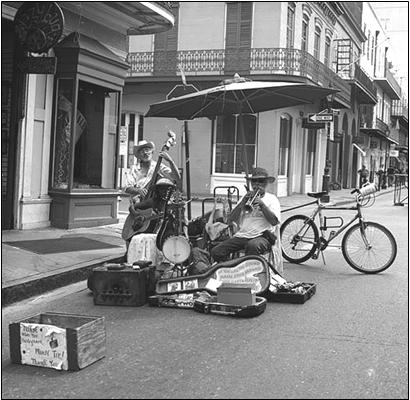 | Hai nghệ sĩ nhạc Jazz ở Bourbon Street, French Quarter, New Orleans sau trận bão Katrina. |