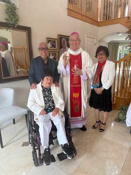 Trong buổi lễ, ngoài nhận lănh Ḿnh Thánh Chúa, Đức Tổng Giám Mục Giuse c̣n làm thêm phép Bí Tích ban B́nh An cho Bồ Câu và cha mẹ. Chúng tôi được Ngài hướng dẫn, cho thêm th́ giờ đọc kinh ăn năn, sám hối và cầu nguyện trong ḷng tin Chúa. Sau đó đến phiên Ngài vừa đọc kinh vừa làm dấu thánh giá với dầu thánh xức vào 2 ḷng bàn tay và trên trán cho từng người một. Cuối lễ, Ngài hỏi chúng tôi về phần đạo lư của cháu Bồ Câu. Sau khi biết cháu đă nhận được phép Bí Tích Rước Lễ Vỡ Ḷng (Communion) lúc 15 tuổi, tức là 11 năm sau khi bị trở thành khuyết tật, Ngài cho biết Ngài lấy quyền của Giáo Hội cho phép, quyết định cử hành phần Bí Tích Thêm Sức (Confirmation) cho cháu Bồ Câu. Chúng tôi vô cùng hân hoan, ngợi ca Chúa trên trời ban ơn phước cho thiên thần Bồ Câu của chúng tôi nhận đủ phép Bí Tích như những con Chúa b́nh thường khác.