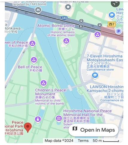 Bước ra xe, tôi choáng váng đến lạnh người, một cảm xúc không thể diễn tả bằng lời, nơi đây vào sáng sớm ngày 6/8/1945 hàng trăm ngàn người bị thiêu rụi, nằm xuống trong đống đổ nát..tôi lặng người, nước mắt trào ra..trước mặt là bức tượng người mẹ tay phải ôm con trước ngực, cong lưng cúi đầu chạy tay trái cầm tay con sau lưng ..chạy..chạy ..sau bức tượng là cột phun nước cao chừng 20 m..Đi vào trong khoảng 50m là viện bảo tàng, đáng lưu ư nhất là chiếc đồng hồ, tại thời điểm chúng tôi ghé lại là 5:52 PM, ngày 3/12/2024, có 2 con số: Số trên 28975 là số ngày tính từ khi Bom Nổ trên thành phố Hiroshima.Số dưới là 0204 là số ngày thử bom nguyên tử cuối cùng kể từ ngày chúng tôi viếng thăm, 3/12/2024.